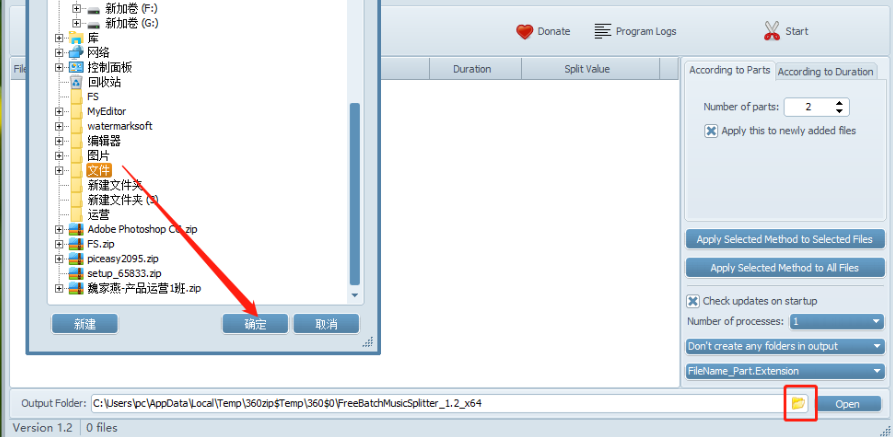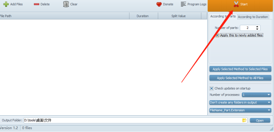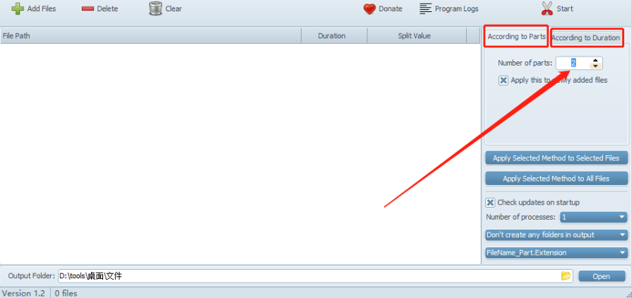 4.选择好输出保存位置之后我们就可以选择分割方式了,According to Parts是根据文件数量进行分割,我们输入自己想要分割的数量即可,另外一个According to Duration是按照时间来分割。
