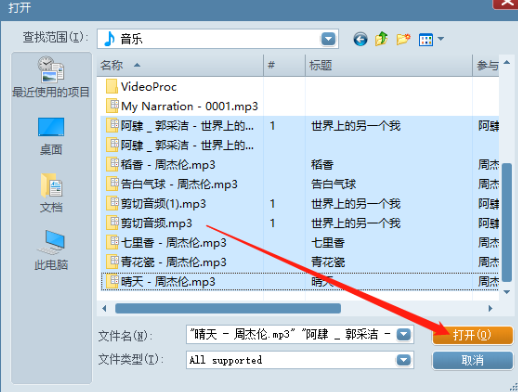 2.点击添加文件之后下一步就会打开一个选择文件的界面了,在这个界面中我们选中目标音频文件之后点击右下角的打开按钮。