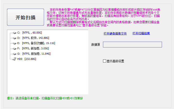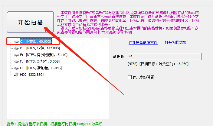 1.首先第一步我们打开软件之后在软件的主界面中点击选择要扫描恢复Excel文件的磁盘,选择好目标磁盘之后点击开始扫描按钮。