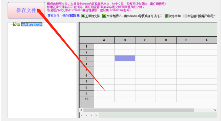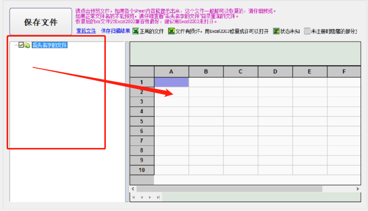 4.最后一步我们在扫描出来的文件列表中,点击自己想要恢复的那一个Excel文件之后,再点击界面左上角的保存文件这个功能按钮就可以将文件恢复了。