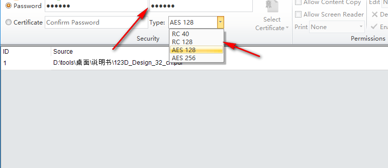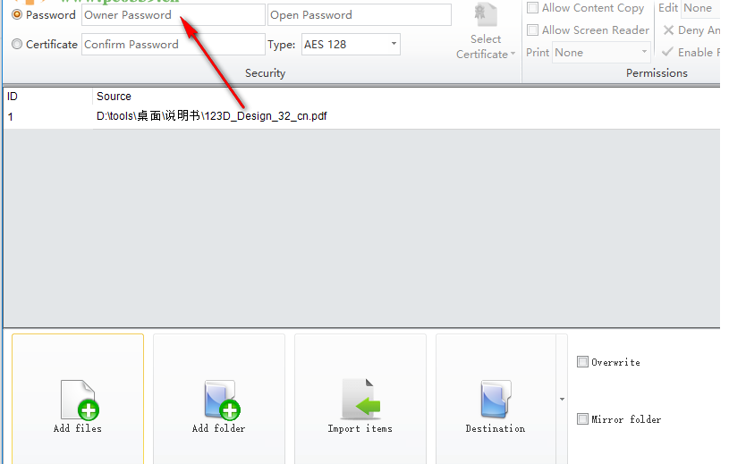 3、如图所示,在这里设置用户的密码,设置打开的密码Owner Password是用户自己管理PDF的密码,Open Password是打开PDF阅读时需要的密码