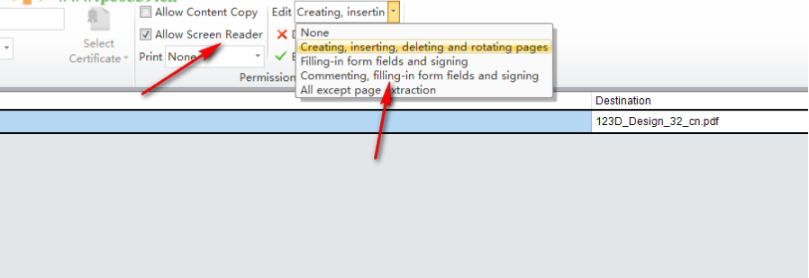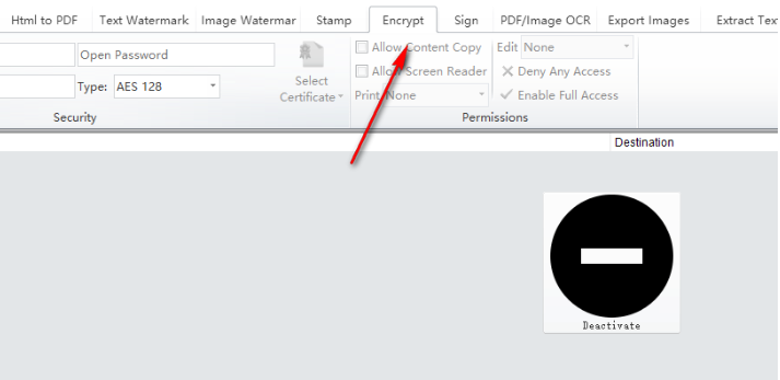 6、这里提供多个设置功能,Allow Content Copy允许复制内容,Allow Screen Reader允许阅读,Deny Any Access拒绝访问,Print是打印设置,Edit是编辑设置,自己勾选需要禁止的功能