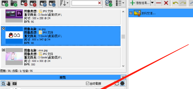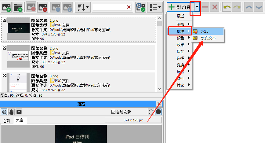 3.打开文件夹之后软件就会自动识别文件中的图片了,等到所有图片都加载进来之后,我们点击右边的添加任务按钮,选择其中的批注,然后点击水印文本。