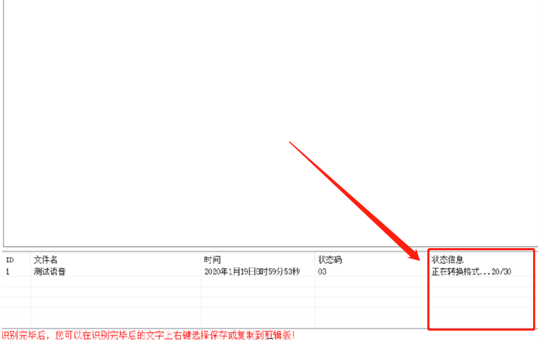 4.开始识别之后在界面右下方的状态信息这里会提示转换语音文件的状态,我们可以在这里观察语音文件转换识别的进度。