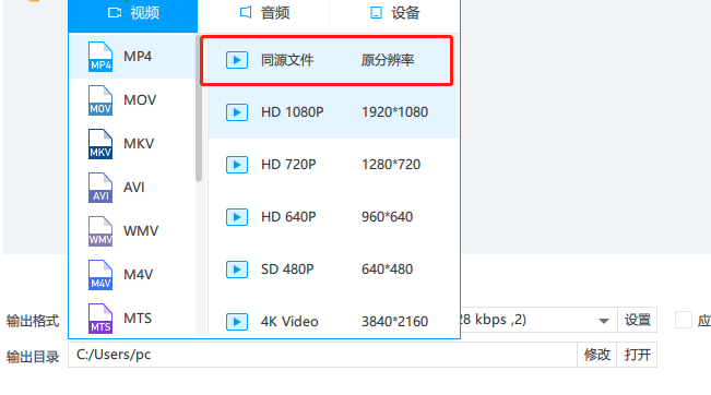 4.点击输出格式之后我们就可以选择自己要输出的文件格式了,在出现的选择界面中点击MP4视频格式即可。