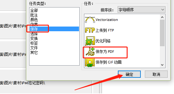 4.点击添加任务按钮之后会出现让我们选择任务的窗口,然后我们在保存这个模块中找到保存为PDF这个选项之后点击确定按钮。