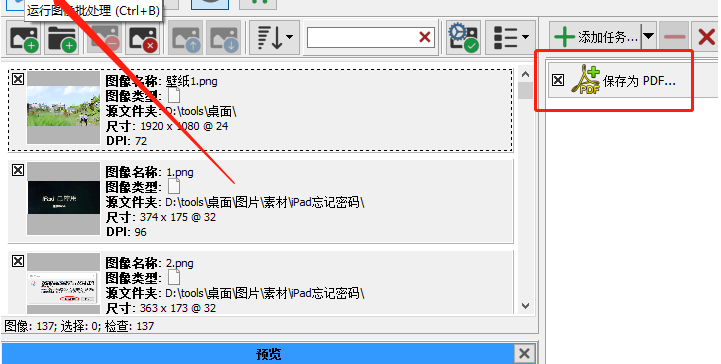 5.点击确定按钮之后在右边的任务列表中可以看到已经添加的保存为PDF的任务。然后我们点击界面左上角的运行处理图标就可以开始批处理图片了。