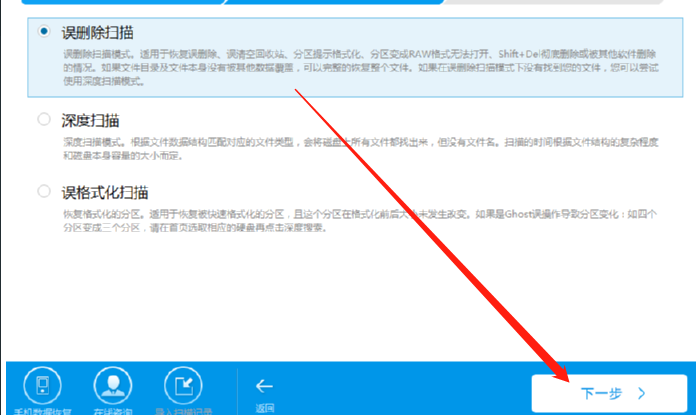 2.点击下一步按钮之后紧接着是需要选择要使用的扫描模式,恢复误删文件的话就点击选中误删除扫描这个扫描模式,然后点击右下角的下一步按钮。
