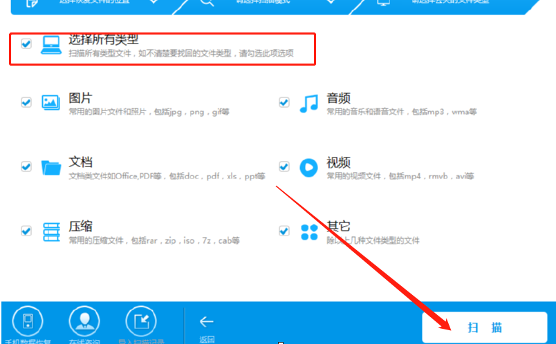3.点击下一步按钮之后紧接着是需要在出现的界面中选择要扫描恢复的文件类型,这个类型就是我们需要恢复的文件类型,需要恢复指定类型的文件的话只选择那一个类型的文件即可,没有的话就可以选择所有类型,然后点击扫描。