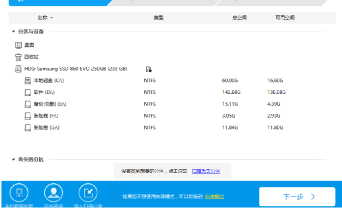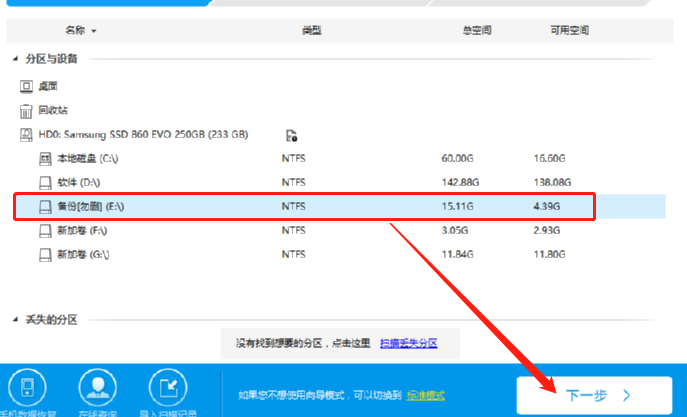 1.首先第一步我们打开软件之后在软件的主界面中点击选中要扫描的磁盘,然后再点击界面右下角的下一步按钮。