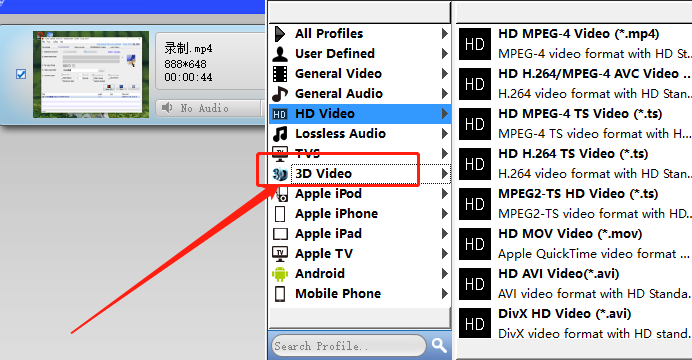 3.将文件成功添加到软件界面之后,在界面上方我们可以看到Profile这个选项,打开它的下拉列表即可选择要转换的视频格式,然我们找到3D Video选项点击之后选择自己想要的格式。