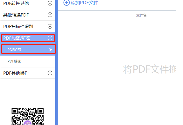 1.首先第一步我们打开软件之后在软件界面的左边找到PDF加密/解密这个功能点击打开,然后就可以在其中找到PDF加密功能选中了。