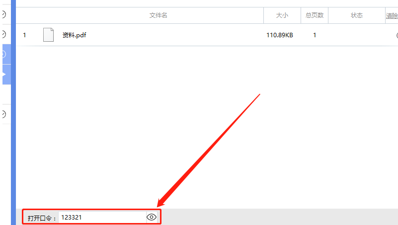 4.点击打开将PDF文件成功添加到软件界面之后,下一步需要在界面的左下角点击打开口令这个输入框,然后就可以在其中输入要设置的密码了。