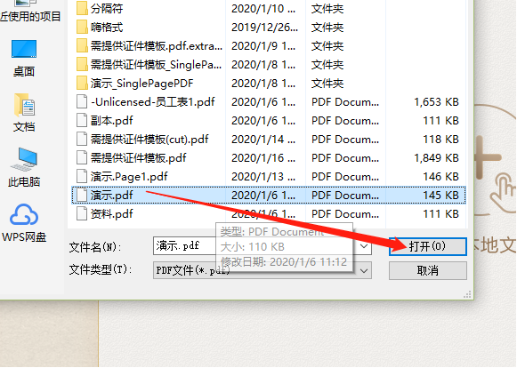 2.点击加号之后下一步会出现供我们选择PDF文件的界面,然后我们在这个界面中选中目标文件之后点击打开按钮。
