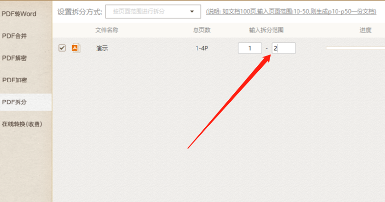 3.点击这个打开按钮文件就添加成功了,然后我们在界面中的输入拆分范围这个位置可以输入我们要拆分的页面范围,用户根据自己的实际情况输入即可。