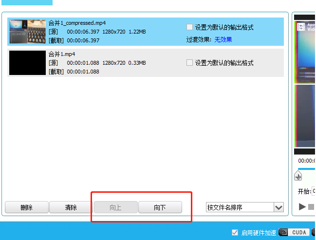 5.输出格式选择完成之后我们在下图中框出的位置可以找到向上和向下按钮,可以用来控制合并视频的顺序。