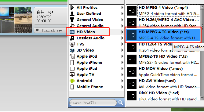 3.点击打开之后视频文件会被加载到软件界面中,然后我们点击上方的文件类型的下拉列表即可选择要转换的格式,我们在高清视频模块中找到ts格式之后点击选择即可。