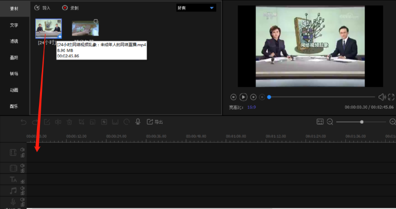 3.点击打开按钮之后下一步在软件界面中选中添加的视频,将它移动到下方的操作轨道上面。