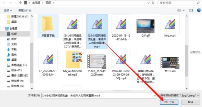 2.点击导入文件之后,下一步就是在出现的选择文件界面中选择想要编辑的视频文件,选中之后点击右下角的打开按钮。