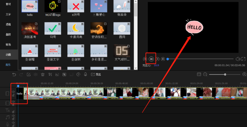 5.拖动到下方的操作台之后,我们将动画移动到视频的最开头,然后点击播放按钮可以播放预览添加视频片头之后的效果。