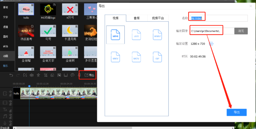 6.最后一步我们查看效果满意之后,点击界面中的导出按钮,然后在出现的导出文件界面,设置好名称和输出路径之后点击导出按钮即可导出。