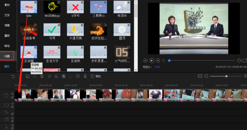 4.紧接着下一步我们就可以点击左边选项中的动画这个功能模块了,然后就可以看到有很多的动画素材,选择自己想要使用的那一个拖动到下方的操作台上。