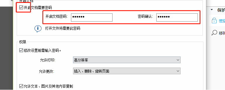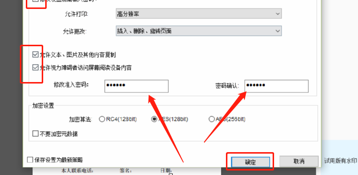 5.另外我们还可以勾选权限这个模块中的一些关于修改PDF文件的权限,选择相关权限之后设置好密码并点击下方的确定按钮即可。