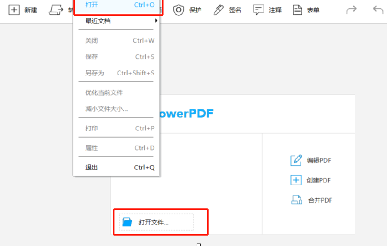 1.首先第一步我们打开软件之后在软件的界面上方点击文件,然后再点击打开选项来选择添加PDF文件,也可以点击下方的打开文件按钮来选择PDF文件。