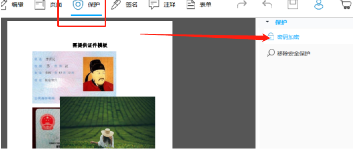 3.将要加密的PDF文件添加到软件界面之后,下一步就是在界面的功能中找到并点击保护这个功能模块,然后点击右侧的密码加密功能。