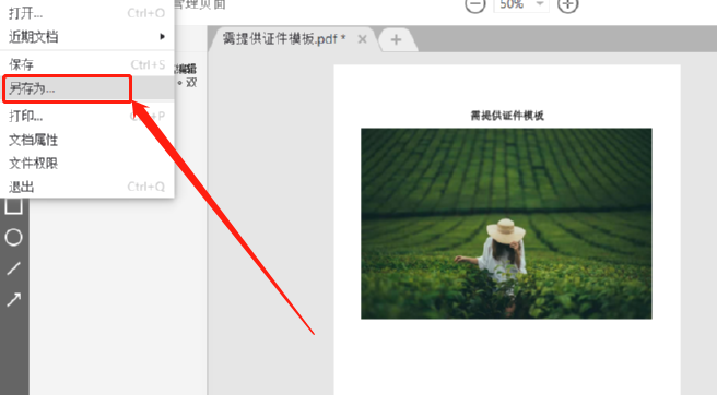 6.最后我们在调整好图片位置之后点击界面左上角的文件选项,然后选择点击其中的另存为按钮就可以将插入好图片的文件保存下来了。