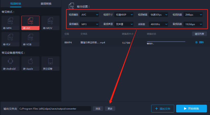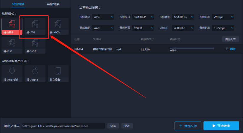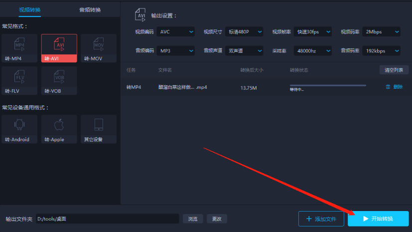 7.最后设置好输出文件路径之后,点击界面右下角的开始转换按钮就可以开始转换MP4为AVI格式的操作了。