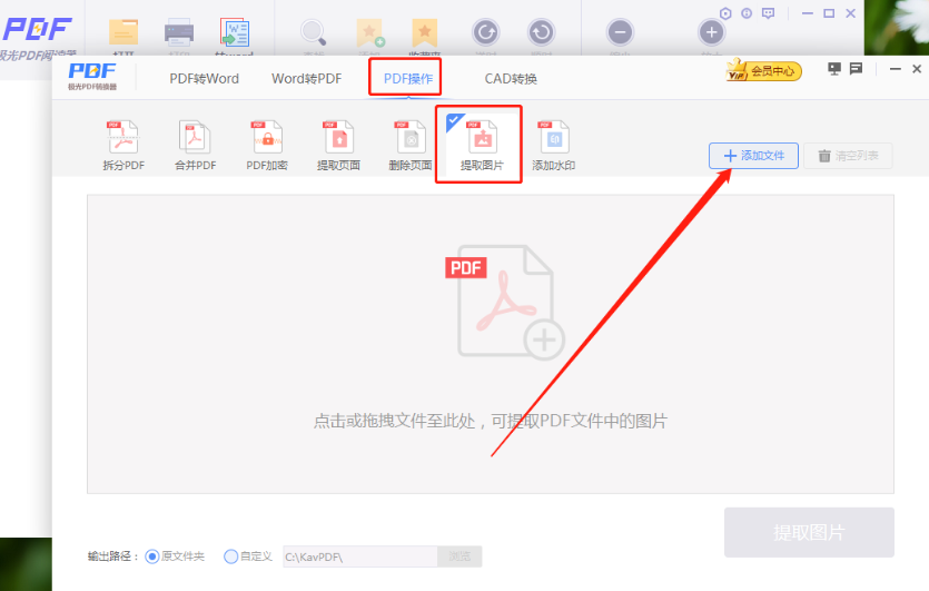 2.点击进入到PDF转换功能界面之后,选择提取图片这个功能,然后点击添加文件按钮,如下图中所示。
