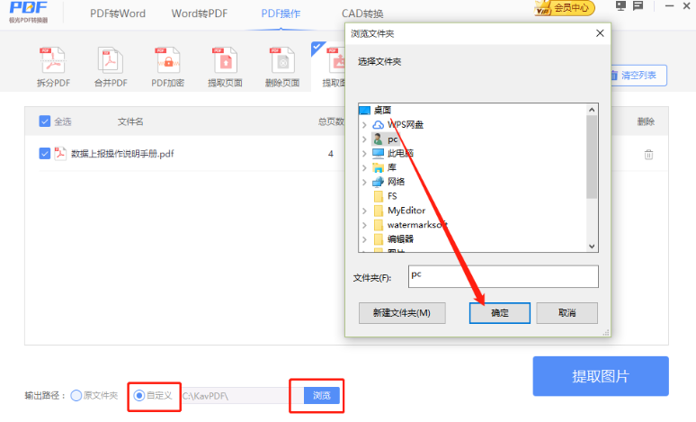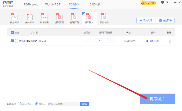 6.点击选择好输出文件夹之后,点击界面右下角的提取图片按钮就可以开始提取PDF文件图片的操作了。