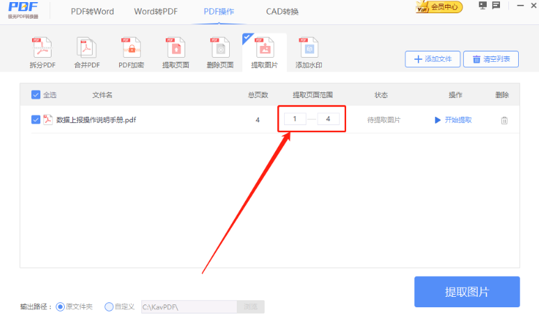 4.点击打开按钮将PDF文件添加到软件界面之后,我们在界面中可以设置提取的页面范围。