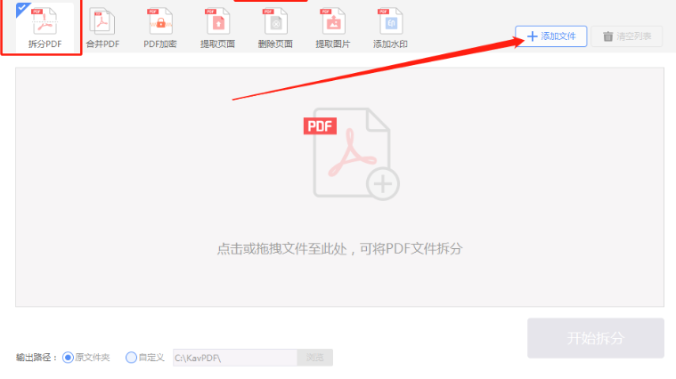 2.进入到PDF转换功能界面之后,我们在上方功能中选择PDF操作,选择之后选中拆分PDF的功能,点击添加文件按钮。