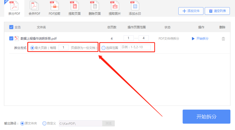 4.点击打开按钮我们就成功的将文件添加到软件界面了,然后下一步是在界面中选择想要使用的拆分方式,有按最大页数进行拆分以及选择范围进行拆分的两种方式。