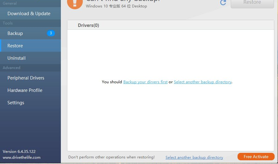 6、备份之后一旦自己的驱动出现损坏的情况,就可以利用下方的还原按钮来进行安装