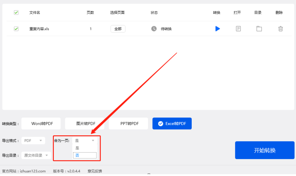 4.点击这个打开按钮之后如果我们选择的是多个Excel文件的话,可以在下方选择是否要合为一页PDF文件,如下图所示。