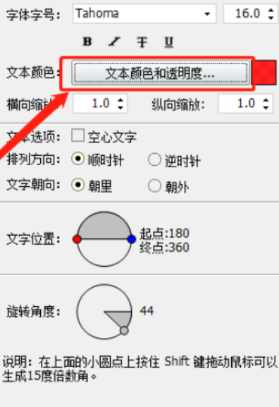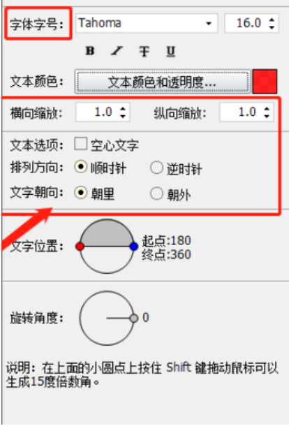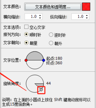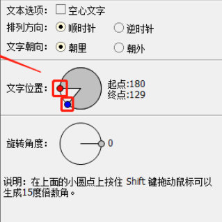 6.另外下一步在下方的文字位置中可以设置文字的起点和终点旋转角度,点击小圆点拖动即可看到文字位置改变的效果。