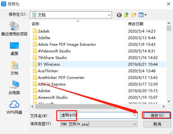 10.点击选择水印类型之后就会出现一个另存为文件的界面,根据自己的需求选择保存位置之后,设置好名称,点击保存按钮即可。