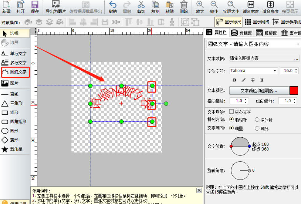 2.小编选择圆弧文字之后,点击界面中间的水印预览区域就会出现圆弧水印的模板了,我们点击绿色的小圆点拖动可以对水印位置、尺寸进行更改。