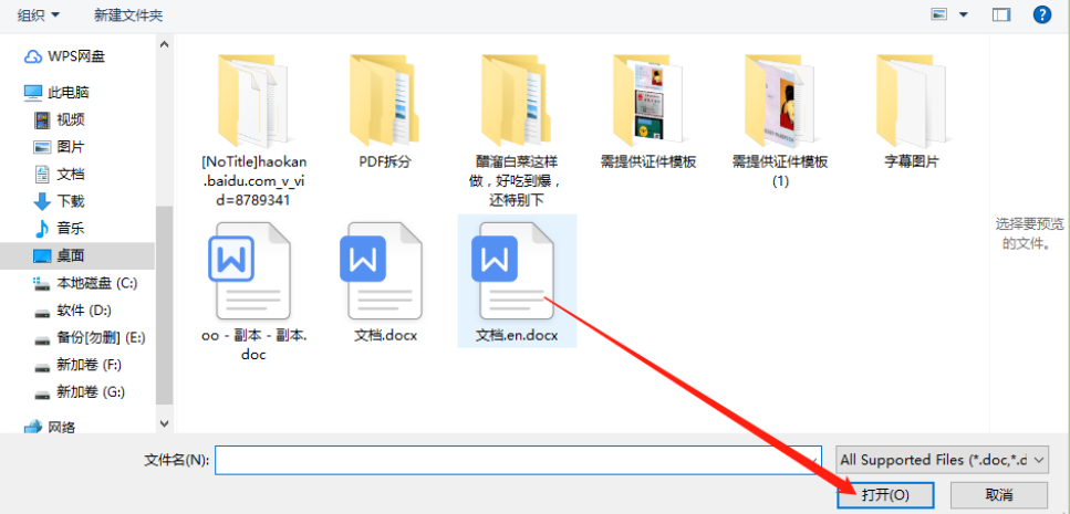 2.点击选择文件按钮之后接下来在打开的选择文件界面中,选中目标Word文件之后点击打开按钮将它添加到软件界面中。