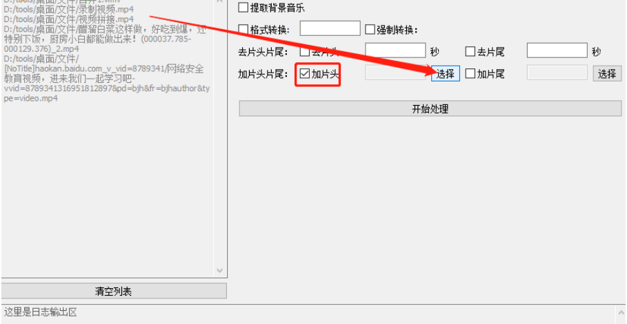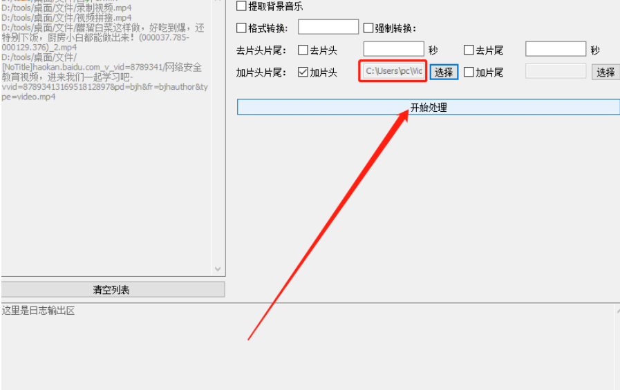 5.最后点击打开按钮,我们就可以看到选择的片头路径了,点击界面中的这个开始处理按钮即可开始给视频添加片头的操作。