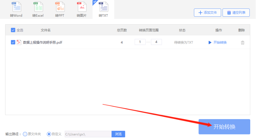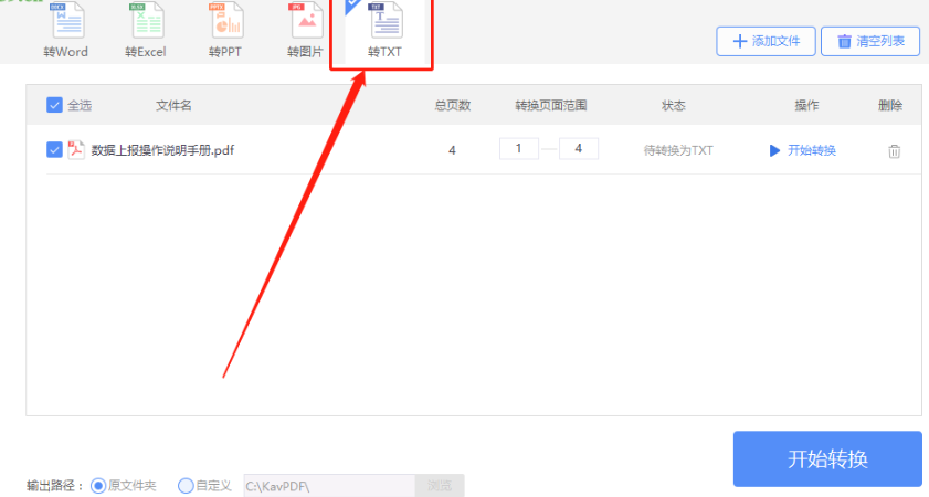 6.点击选择好想要输出保存转换TXT文件的界面之后,我们点击界面右下角的开始转换按钮就可以开始转换操作了。