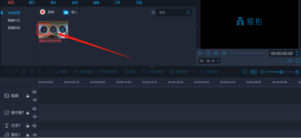 4.点击打开按钮之后在界面就可以看到添加进来的视频了,点击添加图标即可将视频添加到下方的操作轨道当中。