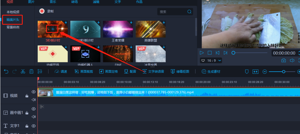 5.将视频添加到下方的操作轨道之后,我们在界面左上方选择精美片头选项,找到之后就可以看到倒计时的片头素材了,点击加号下载它并添加到下方的操作栏中。