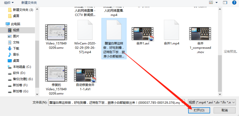 3.点击导入之后就会打开一个选择文件的界面了,在这个界面中我们选中目标视频文件之后点击右下角的打开按钮。