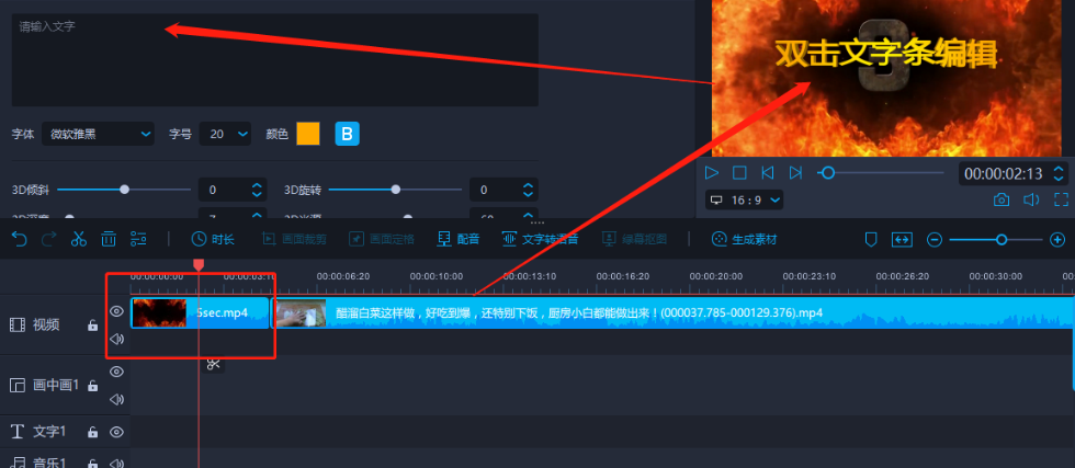 6.点击将片头添加到下方的操作轨道之后,根据提示双击右边的文字条,然后就可以对片头的文字进行编辑。