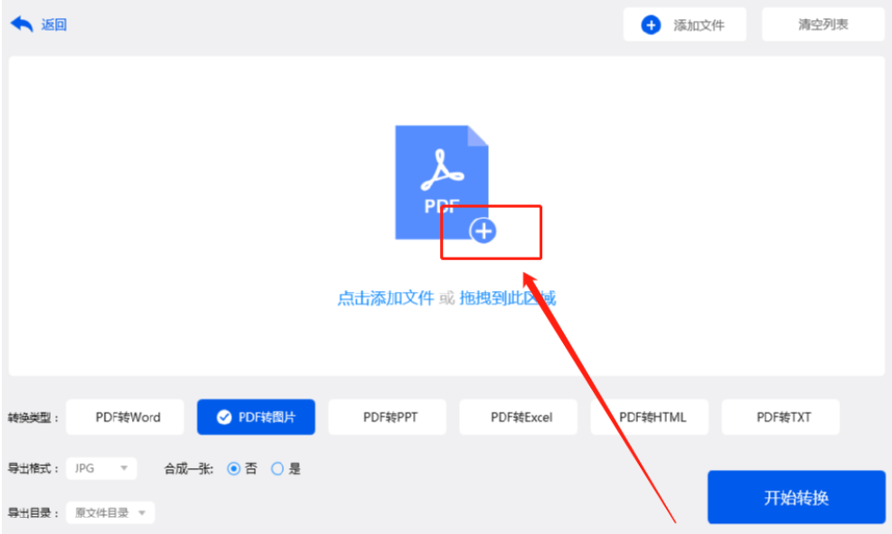 2.点击进入到PDF转文件功能之后,点击选择PDF转图片选项,然后点击界面中间的加号图标。