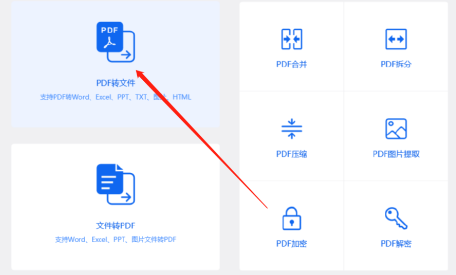1.首先第一步我们打开软件之后在软件主界面中点击PDF转文件这个功能模块,点击之后进入到PDF转换成其他文件的界面。